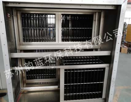 含油烟颗粒物的废气吸入高低压板式末端废气处理设备后,其中部分较大的有雾滴、油污颗粒在均流板上由于机械碰撞、阻留而被捕集。